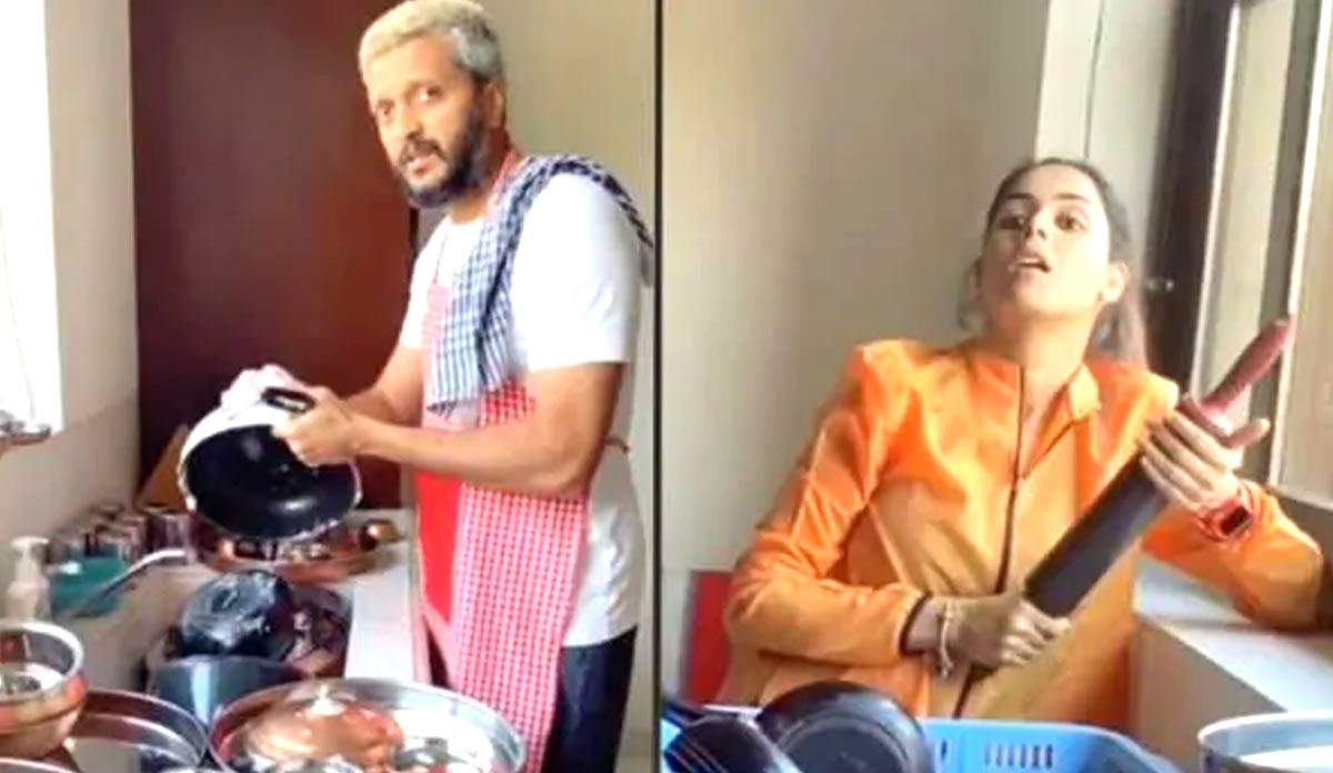 बॉलीवुड एक्टर रितेश देशमुख और उनकी वाइफ व अभिनेत्री जेनेलिया डिसूजा सोशल मीडिया पर काफी एक्टिव हैं और फनी वीडियो शेयर करते रहते हैं। रितेश ने हाल ही में एक वीडियो पोस्ट किया है, जिसमें वो बेलन और पत्नी के डर से घर के बर्तन धो रहे हैं। इस वीडियो को खूब पसंद किया जा रहा है।